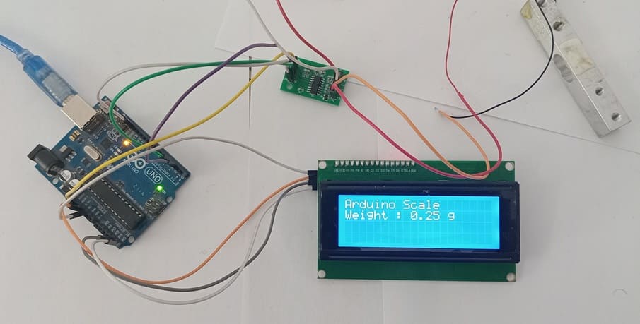 This Arduino program implements a digital weight scale system using an Arduino UNO, an HX711 load cell amplifier, and an LCD I2C display. The program reads weight data from a load cell sensor, processes it using calibration values, and displays the measured weight in grams on the LCD screen.