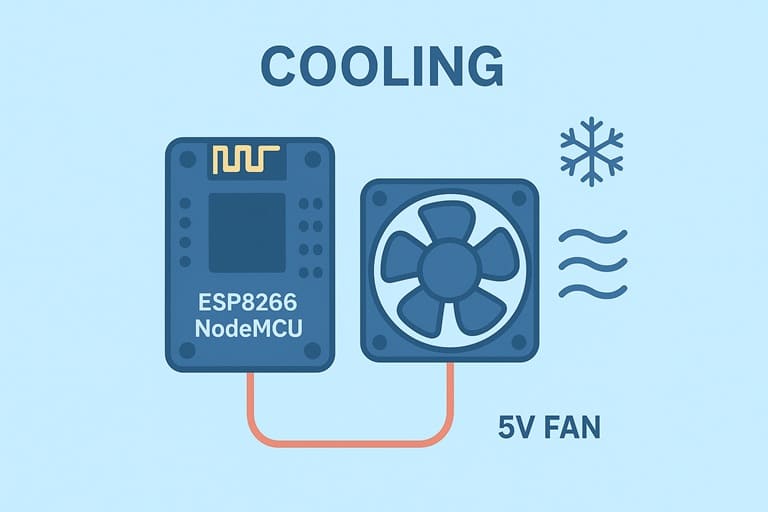 1- When the temperature exceeds the threshold (for example, 30 °C), the ESP8266 sends a signal to the relay module to activate the 5V fan. The fan starts running to cool down the environment.
