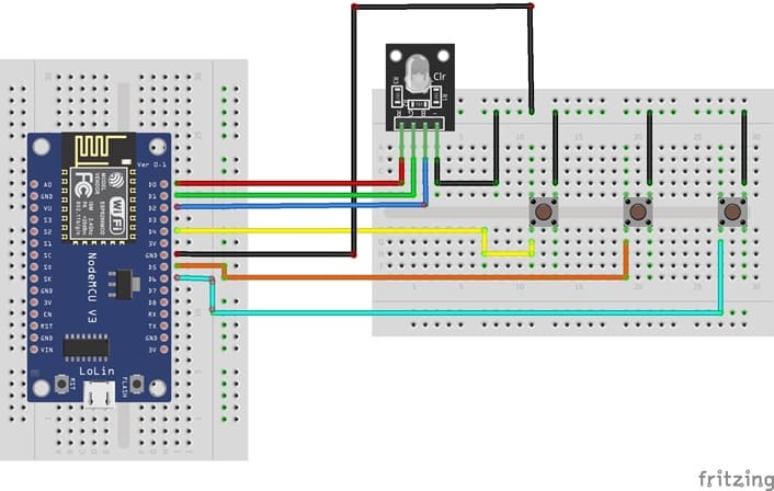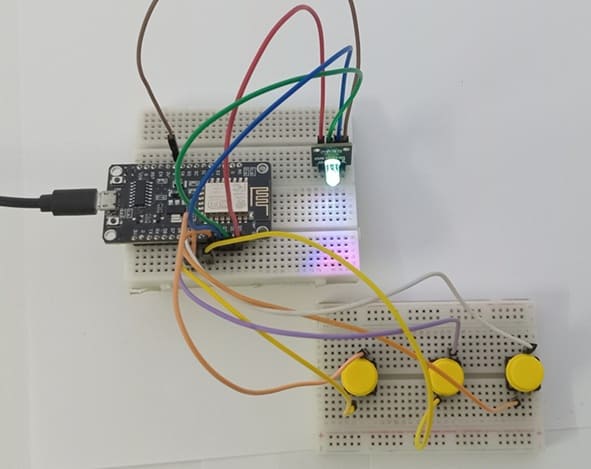 - connect the RGB LED and push buttons properly to the ESP8266 NodeMCU using a breadboard and jumper wires.