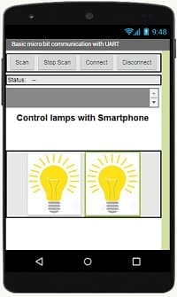 - Open the app and use the buttons to control the two lamps connected to the Micro:bit.