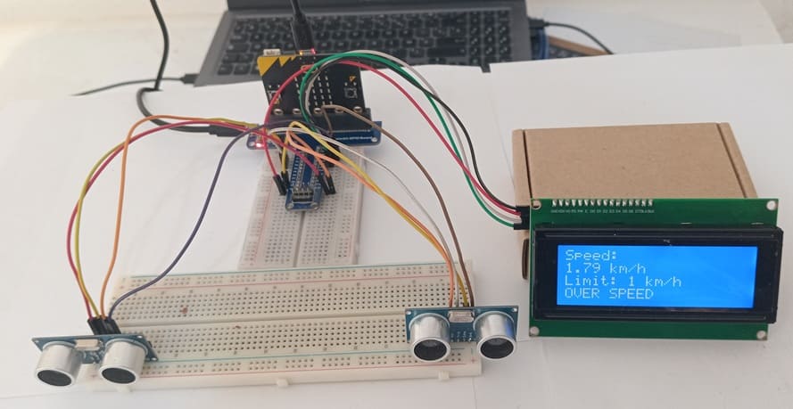 he Micro:bit serves as the main processing unit. It reads data from the ultrasonic sensor, performs speed calculations, controls the LCD display, and activates the buzzer.