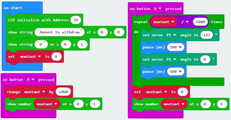 The program then waits for the user to interact with the buttons of the BBC micro:bit. When Button A is pressed, the program increases the value of montant by 1000. This means that each press of Button A adds a fixed amount to the withdrawal value. After increasing the value, the new amount is displayed on the second line of the LCD using the function ShowNumber, allowing the user to see the updated amount in real time.