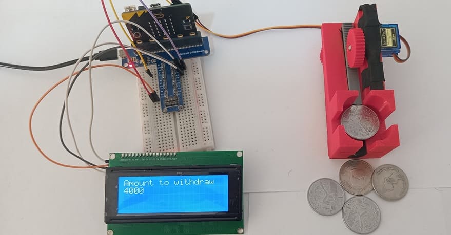 The Micro:bit reads the user inputs from its buttons, calculates the number of coins to dispense, and sends control signals to the actuator that drives the mechanical coin dispenser.