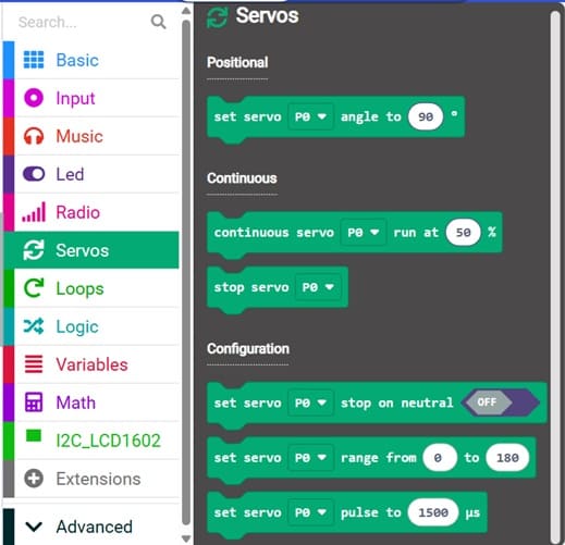 4- In the search bar, type "servo" and you should find an extension for servo motor. Add it to your project.