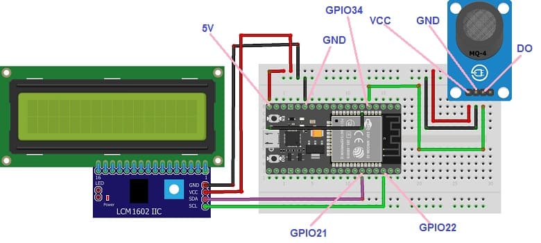 - Connect the DO pin of the MQ-4 sensor to the GPIO34 pin of the ESP32 board