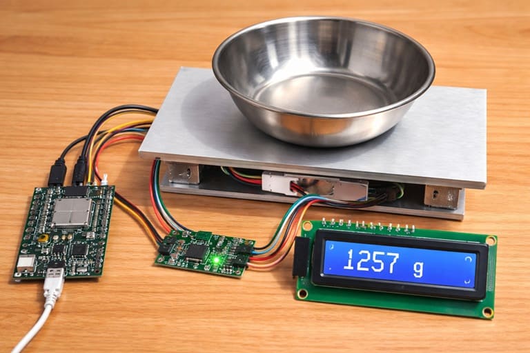 The system works by converting physical weight into an electrical signal and then into a readable digital value. When an object is placed on the load cell platform, the load cell slightly deforms. This deformation changes the internal resistance of the strain gauges inside the load cell, generating a very small analog voltage signal proportional to the applied weight.