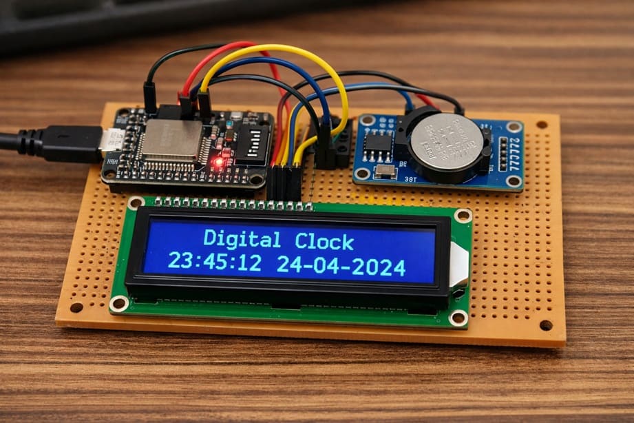 At the end of this project, the ESP32 will continuously read the current time from the RTC module and display it clearly on the LCD I2C screen, creating a functional and reliable digital clock.