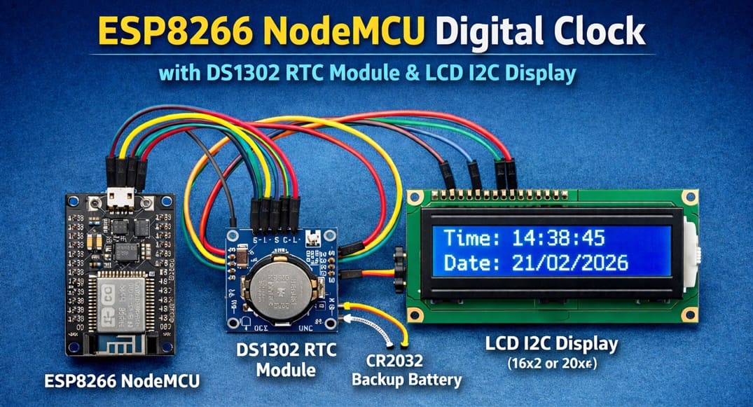 The ESP8266 NodeMCU is a microcontroller. It acts as the main controller of the project. Its role is to communicate with the DS1302 RTC module to read the current time and date, process the data, and send it to the LCD I2C display.