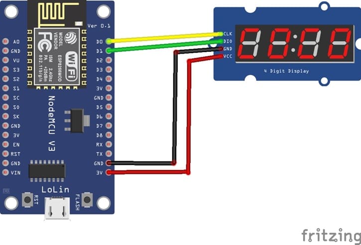 - connect the TM1637 module to the ESP8266 using only two pins (DIO and CLK).