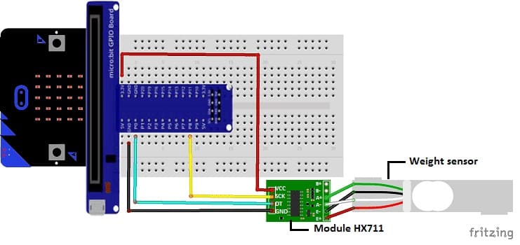 The HX711 module reads weight data from the load cell, amplifies the signal, and sends it to the Micro:bit via digital pins.