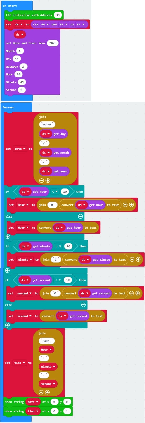 This MakeCode program allows the Micro:bit to create a digital clock system using the DS1302 RTC Module and an LCD I2C display. The clock shows the current date and time in real-time on the LCD screen.