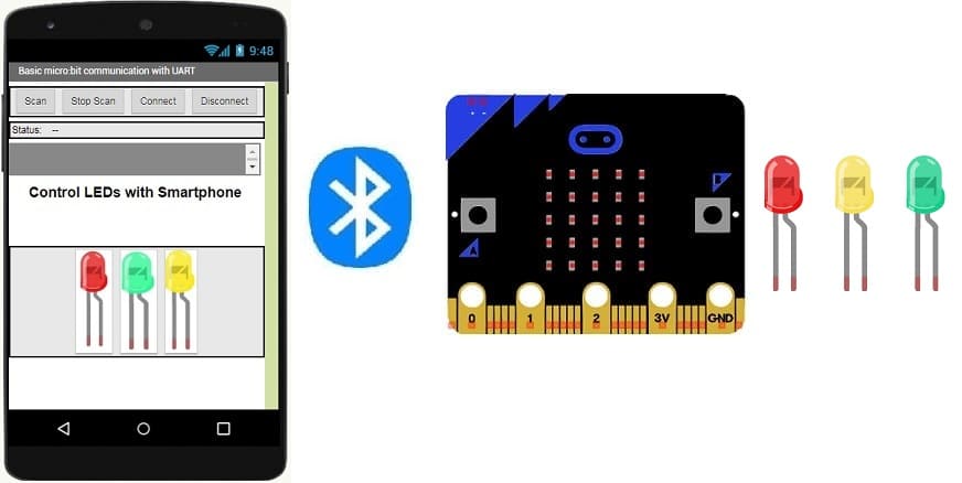 الآن يمكنك التحكم في إضاءة ثلاثة صمامات على لوحة الميكروبيت باستخدام هاتفك الذكي عبر البلوتوث. يمكنك تخصيص التطبيق لتحقيق وظائف معينة مثل تشغيل وإيقاف الالصمام أو تغيير لونه وما إلى ذلك حسب احتياجاتك.