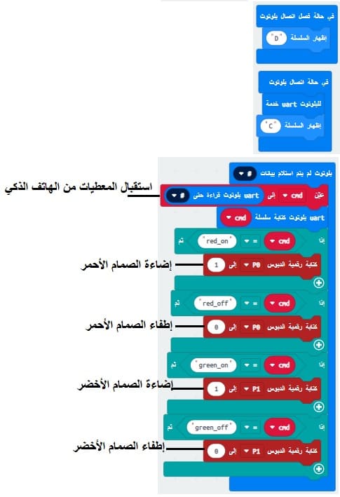 لتحقيق إضاءة الصمام الثنائي الباعث للضوء (LED) متصل بلوحة الميكروبيت باستخدام هاتف ذكي عبر البلوتوث، يجب اتباع الخطوات التالية: