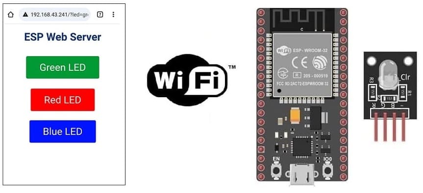 def web_page(): html = """<html><head> <title>ESP Web Server</title> <meta name="viewport" content="width=device-width, initial-scale=1"> <link rel="icon" href="data:,"> <style>html{font-family: Helvetica; display:inline-block; margin: 0px auto; text-align: center;} h1{color: #0F3376; padding: 2vh;}p{font-size: 1.5rem;}.button{display: inline-block; background-color: #009933; border: none; border-radius: 4px; color: white; padding: 16px 40px; text-decoration: none; font-size: 30px; margin: 2px; cursor: pointer;} .button2{background-color: #e7bd3b;} .button3{background-color: #ff0000;}</style></head> <body> <h1>ESP Web Server</h1> <p><a href="/?led=green"><button class="button">Green LED</button></a></p> <p><a href="/?led=blue"><button class="button button2">Blue LED</button></a></p> <p><a href="/?led=red"><button class="button button3">Red LED</button></a></p></body></html>""" return html s = socket.socket(socket.AF_INET, socket.SOCK_STREAM) s.bind(('', 80)) s.listen(5) red_on=0 green_on=0 blue_on=0 while True: conn, addr = s.accept() print('Got a connection from %s' % str(addr)) request = conn.recv(1024) request = str(request) print('Content = %s' % request) red = request.find('/?led=red') green = request.find('/?led=green') blue = request.find('/?led=blue') if red == 6: # نضغط على الزر الأحمر if red_on==0: print('RED') red_led.value(1) # تحويل وحدة الصمام ثلاثي الألوان إلى اللون الأحمر red_on=1 else: red_on=0 red_led.value(0) # إطفاء اللون الأحمر if green == 6: # نضغط على الزر الأخضر if green_on==0: print('green') green_led.value(1) # تحويل وحدة الصمام ثلاثي الألوان إلى اللون الأخضر green_on=1 else: green_led.value(0) # إيقاف تشغيل الصمام الأخضر green_on=0 if blue == 6: # نضغط على الزر الأزرق if blue_on==0: print('blue') blue_led.value(1) # تحويل وحدة الصمام ثلاثي الألوان إلى اللون الأزرق blue_on=1 else: blue_led.value(0) # إطفاء اللون الأزرق blue_on=0 response = web_page() conn.send('HTTP/1.1 200 OK\n') conn.send('Content-Type: text/html\n') conn.send('Connection: close\n\n') conn.sendall(response) conn.close() |
