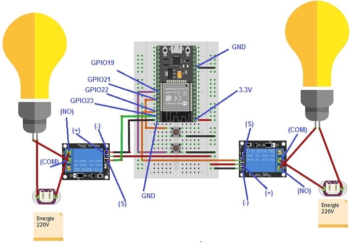 لتركيب لوحة  مع مصباحين، ستحتاج إلى مرحل لعزل الجهد المنخفض للوحة ESP32 عن الجهد العالي للمصباحين. فيما يلي دليل خطوة بخطوة لإكمال هذا التجميع بأمان: