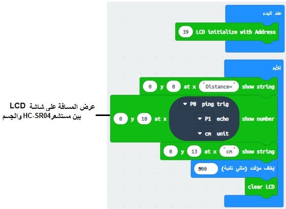 لبرمجة لوحة المايكروبيت باستخدام لوحة الاكترونات MakeCode لقياس المسافة باستخدام حساس HC-SR04، يمكنك اتباع الخطوات التالية: