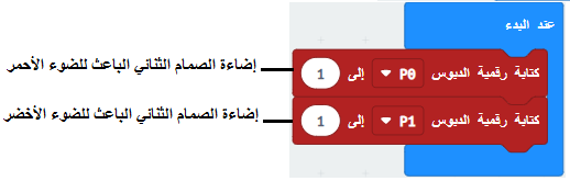 أدخل الكتلة كتابة رقمية P0 “إلى 1 من قسم “الدبابيس” في مساحة العمل ، في كتلة “عند البدء .