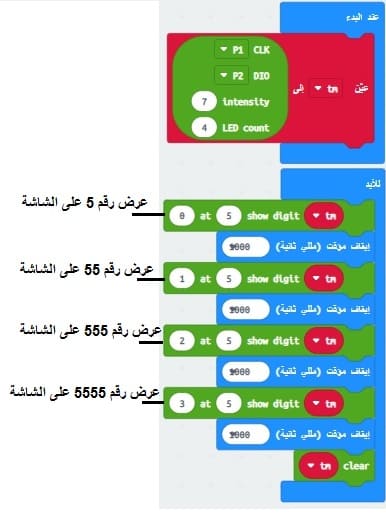 الآن، يمكنك استخدام الكتل البرمجية التالية لعرض الأعداد على شاشة TM1637: