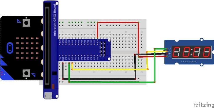 P2 على لوحة المايكروبيت يتصل بطرف DIO (البيانات) على شاشة TM1637.