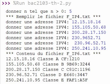 Ce programme définit la procédure remplir_fichier_ipv4(n) dont le rôle est de créer (ou écraser) le fichier texte F_IP4.txt et d’y enregistrer n adresses IPv4 valides, saisies par l’utilisateur.