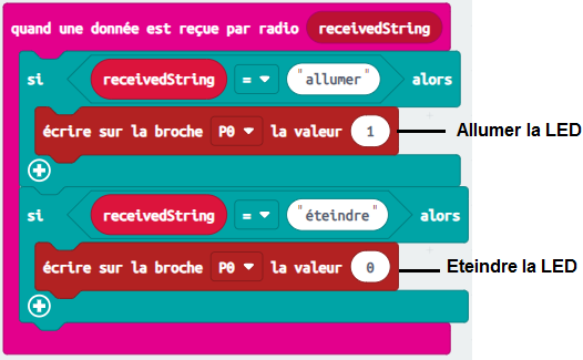 Ce code vérifie la chaîne de caractères reçue par radio. Si la chaîne est "allumer", il allume la LED connectée à la broche P0 de la carte Micro:bit réceptrice. Si la chaîne est "éteindre", il éteint la LED.