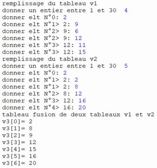 3- Fusion des tableaux V1 et V2 dans V3 : Combinez les deux tableaux en éliminant les doublons et en maintenant l'ordre croissant.