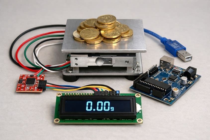 La cellule de charge (load cell) est le capteur de poids. Elle fonctionne grâce à des jauges de contrainte internes qui se déforment légèrement lorsqu’un objet est placé dessus. Cette déformation provoque une variation de tension proportionnelle au poids appliqué.