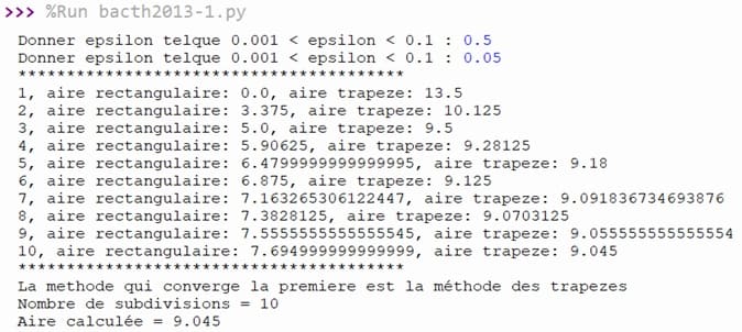N.B.: Le traitement s'arrête lorsque l'aire calculée par l'une des deux méthodes converge vers l'aire exacte a epsilon près (avec 10-3 < epsilon < 10-1), d'afficher le contenu du fichier "CalcuLdat", la méthode qui converge la première vers l'aire exacte a epsilon près, le nombre de subdivisions et l'aire calculée correspondants.