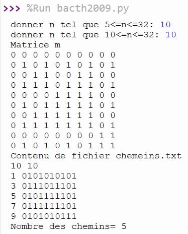 Soit p et q deux entiers naturels tels que 5 :5_ p < q < 32. On se propose de remplir une matrice M à p lignes et q colonnes par des zéros (0) et des uns (1) de la façon suivante : On mettra 1 dans toute cellule M[i , j] si les représentations de i et de j dans la base 2 ont au moins une fois le chiffre 1 à la même position sinon on y mettra 0. On commencera à lire les positions à partir de la droite. Exemples M[5 , 3] aura la valeur 1 car les deux représentations binaires ont le chiffre 1 à la première position. En effet : 5 = (101)2 et 3 (11)2 M[9 , 4] aura la valeur 0 car les deux représentations binaires n'ont pas de 1 à la même place. En effet : 9 = (1001)2 et 4 = (100)2 On se propose ensuite de chercher tous les chemins rectilignes menant de la première ligne à la dernière ligne en n'empruntant que des cellules contenant des 1 et en sautant au maximum une seule cellule contenant 0. Par conséquent, un chemin rectiligne est une colonne ne comportant pas deux cellules consécutives contenant 0. Pour tout chemin trouvé, on affichera son numéro (l'indice j). En plus, les données relatives à ce problème seront enregistrées dans un fichier texte intitulé chemins.txt et placé sur la racine du disque D. Ce fichier comportera dans sa première ligne le naturel p suivi d'une espace, suivie du naturel q et comportera dans chacune des lignes qui suivent le numéro du chemin trouvé. La dernière ligne contiendra le nombre de chemins trouvés.