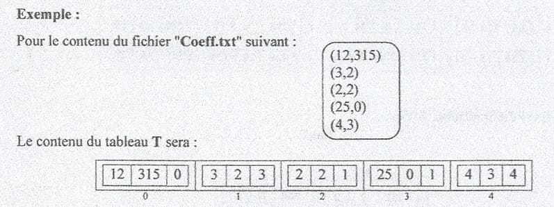 On se propose de remplir un tableau d'enregistrements T à partir d'un fichier texte nommé "Coeff.txt" qui contient dans chaque ligne un couple d'entiers ayant comme format (n,k). Chaque enregistrement du tableau T contiendra les trois champs suivants :