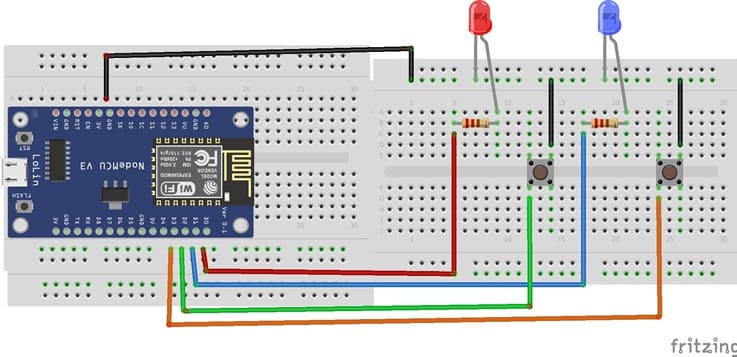 4- programmer la carte ESP32 avec MicroPython afin de lire l’état des boutons poussoirs et de contrôler en conséquence l’allumage des deux LEDs.