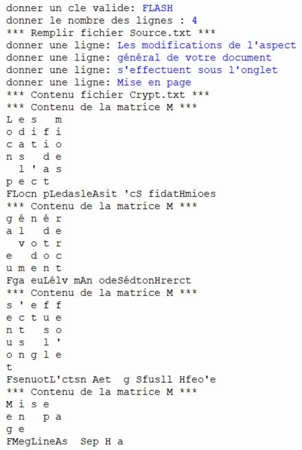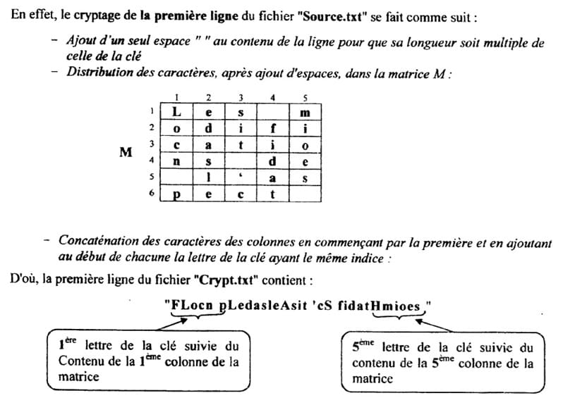 - distribuer les caractères de la ligne à crypter, après ajout d'espaces, dans une matrice M de L lignes et C colonnes en commençant par le remplissage de la première ligne de la matrice, puis la deuxième ligne et ainsi de suite. C et L représentent respectivement la ongueur de la clé de cryptage et le nombre de lignes remplies de la matrice M,