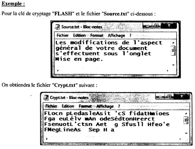 On se propose de réaliser le cryptage du contenu du fichier "Source.txt", ligne par ligne, pour générer un deuxième fichier texte nommé "Crypt.txt" en utilisant une clé de cryptage constituée de lettres majuscules distinctes.