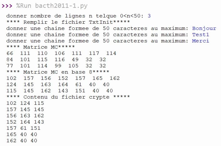 Stocker dans « TxtCryp.txt », les colonnes de la matrice MC, de la colonne la plus a gauche a la colonne la plus a droite. Chaque colonne de la matrice MC occupera une ligne et les éléments de cette ligne seront séparés par le caractère espace.