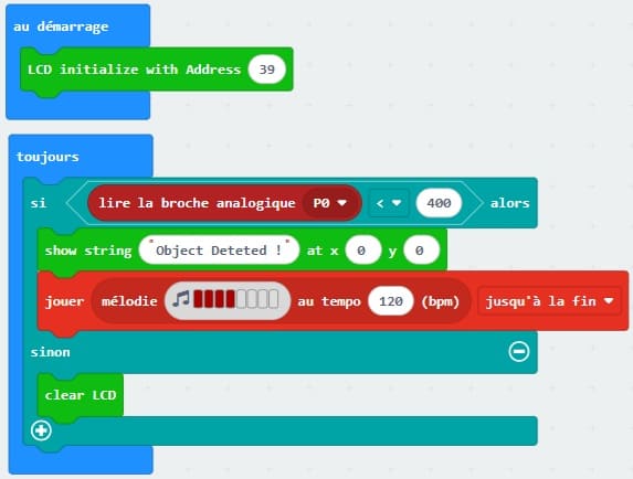 Ce programme réalisé avec MakeCode pour Micro:bit permet de détecter un obstacle à l’aide d’un capteur connecté à la broche P0, puis d’afficher un message sur un écran LCD I2C et de générer un signal sonore.
