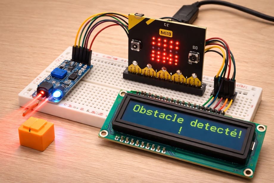 L’objectif de ce projet est de concevoir un système embarqué capable de détecter la présence d’un obstacle en utilisant la carte Micro:bit, le capteur infrarouge FC-51 et un afficheur LCD I2C. Ce système permet d’informer l’utilisateur en temps réel de l’état de l’environnement (présence ou absence d’un obstacle). Il peut être utilisé dans plusieurs applications pratiques, notamment les robots éviteurs d’obstacles, les systèmes de sécurité ou encore des dispositifs d’automatisation domestique.