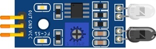 Le capteur FC-51 est un capteur infrarouge utilisé pour la détection d’obstacles à courte distance. Il dispose généralement de trois broches : VCC, GND et OUT. En utilisant la carte d’extension GPIO, la connexion devient directe : VCC est relié à 3V, GND à la masse, et la sortie OUT est connectée à une broche numérique de la Micro:bit (par exemple P0). Ce capteur intègre un potentiomètre permettant de régler la sensibilité de détection.