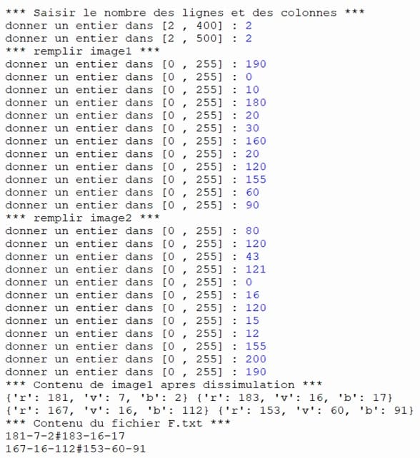 La procédure remplir_fichier sauvegarde l’image finale (contenant l’image dissimulée) dans un fichier texte, en conservant la structure de l’image et les valeurs RGB de chaque pixel.