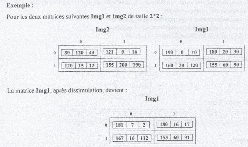 1) Déclarer un type pour les matrices représentant les deux images Img1 et Img2 sachant que 2 < L < 400 et 2 < C < 500, ainsi que tous les types nécessaires à sa déclaration. 2) Ecrire un algorithme d'un module Resultat (Imgl , Img2 , L , C) permettant de dissimuler une image représentée par une matrice Img2 dans une image représentée par une matrice Imgl, en appliquant le principe décrit précédemment sachant que les deux matrices Img1 et Img2 ont le même nombre de lignes L et le même nombre de colonnes C.