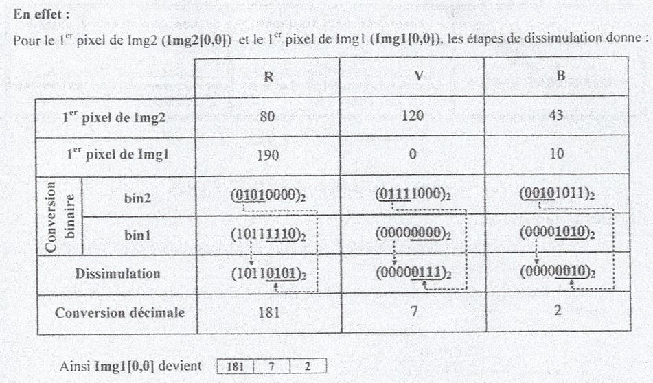 1- Conversion binaire : convertir en binaire les deux codes décimaux de la couleur rouge des deux pixels pour obtenir ainsi deux nombres binaires chacun de 8 chiffres : binl pour le pixel de Imgl et bin2 pour le pixel de