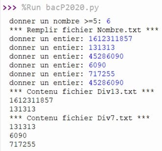 - Placer les nombres du fichier "Nombre.txt" qui sont divisibles par 13 dans un fichier nommé "Div13.txt" en utilisant le module Divis13 et les nombres divisibles par 7 dans un fichier nommé "Div7.txt" en appliquant la règle de divisibilité par 7 expliquée ci-dessus.