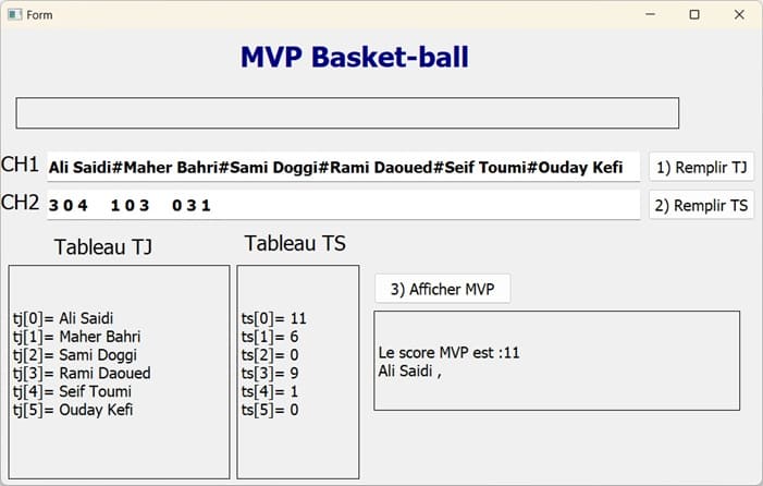 - de remplir un tableau TJ par n noms de joueurs distincts et composés uniquement de lettres alphabétiques et d'espaces (avec 5≤n≤30) .