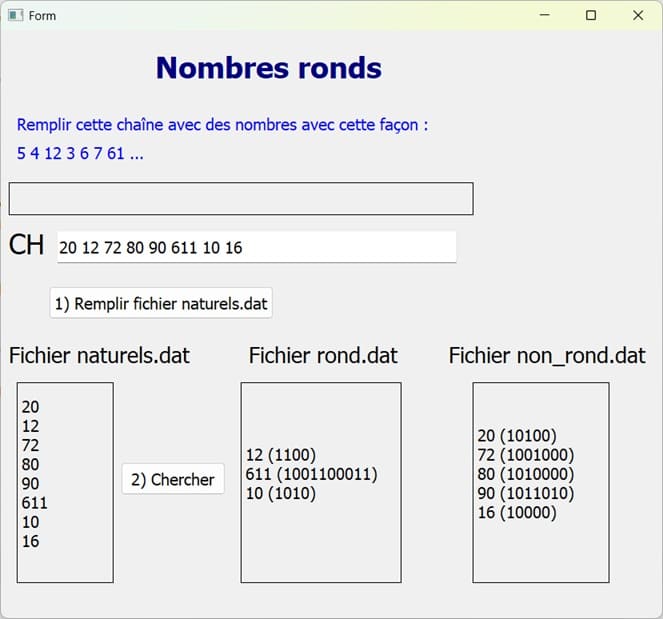 Ce programme demande un nombre n (entre 10 et 100), saisit n nombres naturels (< 3200), puis sépare ces nombres en deux fichiers selon qu’ils possèdent ou non un nombre égal de zéros et de uns dans leur écriture binaire.