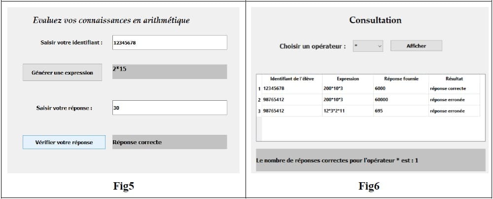 ~ "Interface_Consultation" (voir Fig2 de l’annexe) : destinée aux enseignants, elle permet de faire le suivi des progrès des élèves. Elle affiche, pour le type d'opérateur sélectionné (+, -, *), les identifiants des élèves, les expressions évaluées relatives à cet opérateur, les réponses fournies et les résultats obtenus. Ces informations sont extraites du fichier "Evaluations.dat".