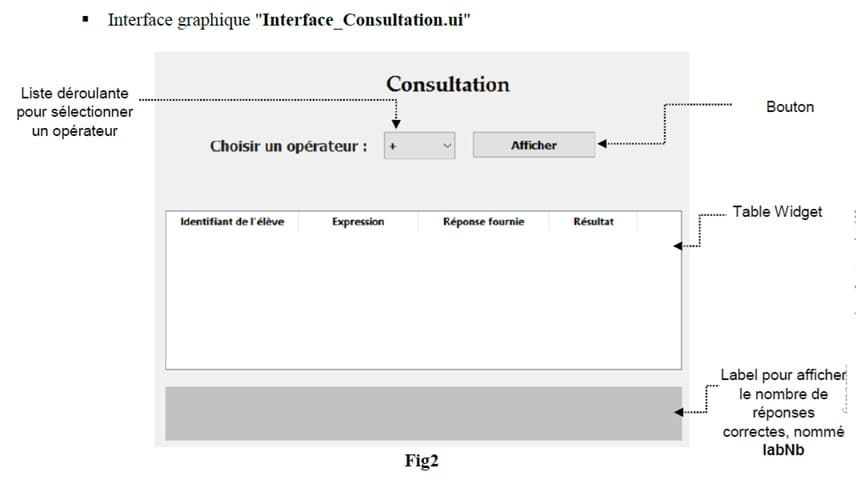 - de remplir l’objet "table Widget" par les enregistrements du fichier "dat" dont le champ exp contient l'opérateur sélectionné dans la liste déroulante. Pour la colonne Résultat, afficher "réponse correcte" ou "réponse erronée" selon la valeur du champ "valid" (voir Fig6 de l’annexe).