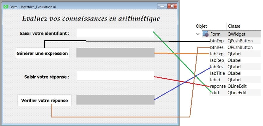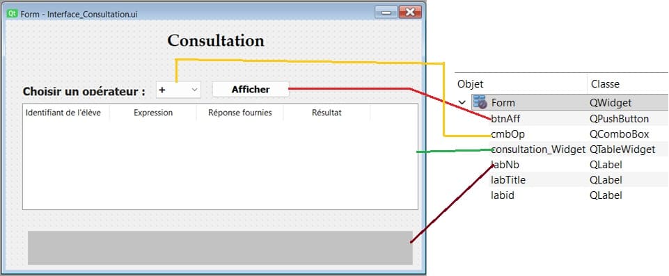- QPushButton : nommé "btnRes" pour lancer la validation de la réponse de l'élève.