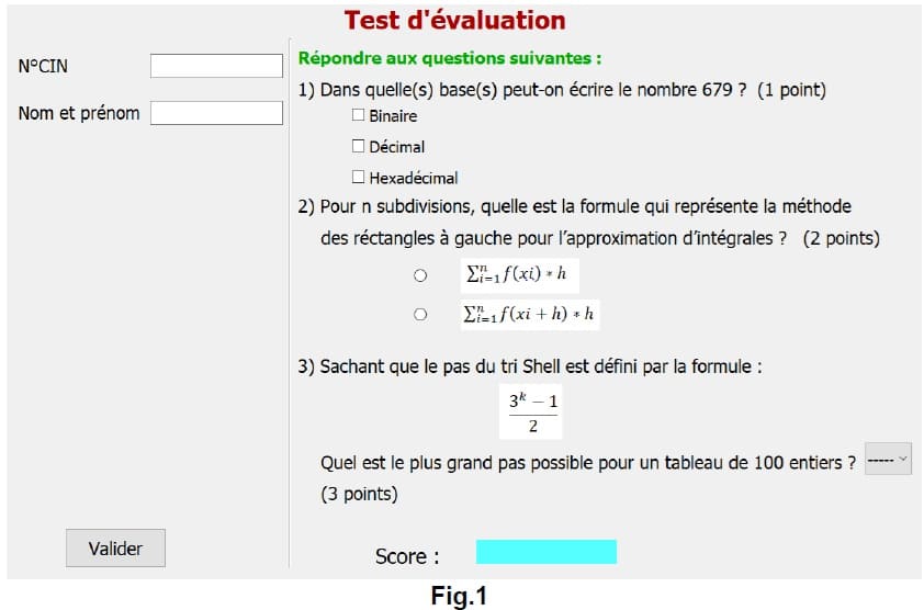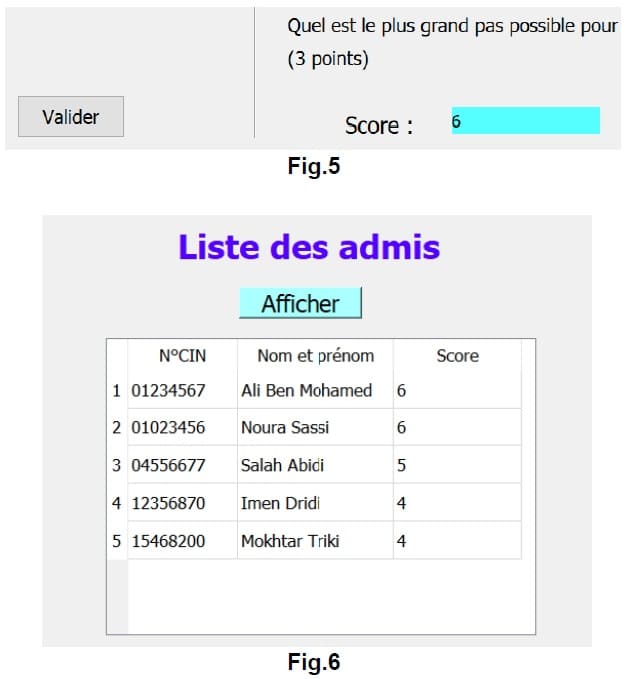 - de calculer et d’afficher, dans le label dédié à l’affichage, le Score obtenu par le candidat (voir la figure Fig.5 de l’annexe),