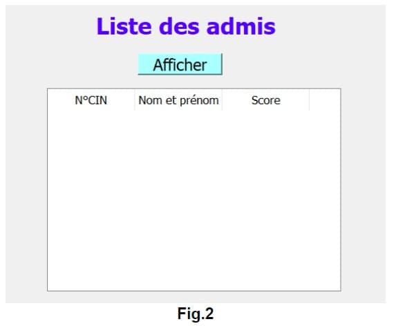 - Apporter les modifications nécessaires au fichier "py" afin de développer le module "Afficher" qui s’exécute suite au clic sur le bouton "Afficher" et qui permet d’afficher dans l’objet "Table Widget" la liste des candidats admis dans l’ordre croissant du Score, sachant qu’un candidat est déclaré admis si son Score est supérieur ou égal à 3. Pour chaque candidat admis, on affiche le NCIN, le NomPrenom et le Score (voir la figure Fig.6 de l’annexe).