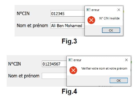 a) Développer le module "Verif" qui permet de tester la validité des informations saisies et d’afficher un message d’erreur (voir les figures 3 et Fig.4 de l’annexe) selon les contraintes indiquées dans le tableau suivant :