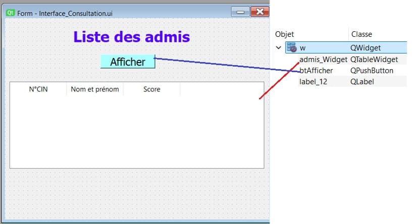 - QTableWidget nommé "admis_Widget" contenant la liste des candidats admis dans l’ordre croissant du Score.